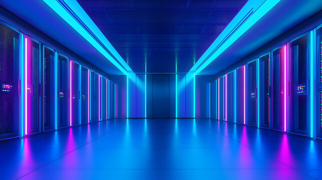 Illuminated servers data center interior design modern environment wide-angle view ambient light concept
