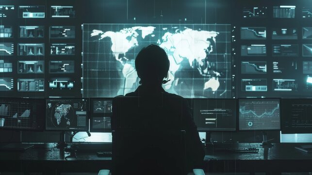 A cybersecurity expert monitoring threats on a large digital map, in a dark, minimal command center, styled as neo-noir.