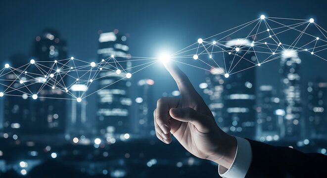 A finger touches a glowing network connection point over a blurred cityscape at night representing future technology