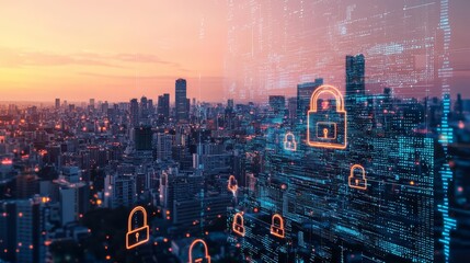 Digital currency symbols and financial data interface over modern cityscape at sunset, showcasing global market price concept with light effects.