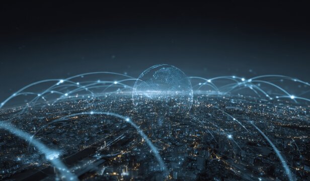 A night cityscape featuring digital connections over a skyline.
