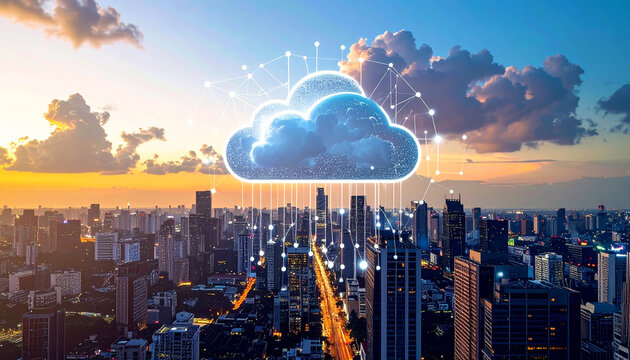 Cloud Computing Over Urban Skyline: A vibrant visualization of cloud computing, with a luminous cloud formation hovering above a modern cityscape.