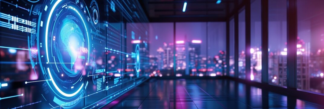 Wide-angle view of a high-tech digital interface with global data visualization in a modern server room against a cityscape