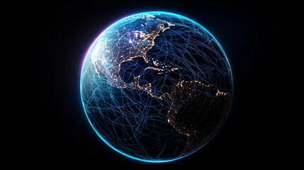 A digital representation of global connectivity featuring a network of data points and lines over a map of the Earth, all illuminated against a dark background