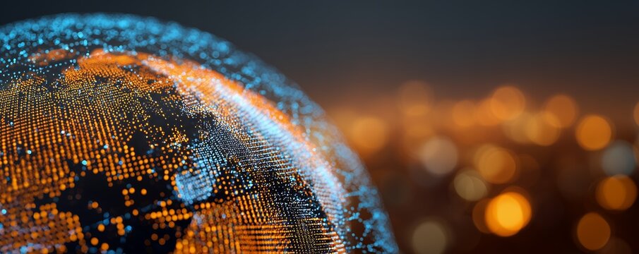 Abstract sphere constructed from glowing dots against a blurred background of bokeh lights, concept for digital communication, technological advancement and global connectivity