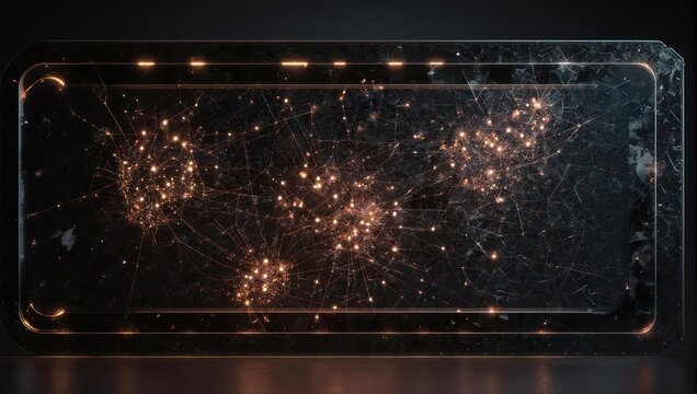 A rectangular, distressed glass frame.  Network map within.  Warm orange highlights