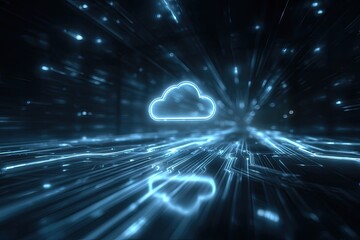 A glowing cloud symbol floats amidst a digital data stream, representing cloud computing