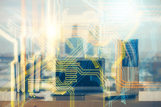 Multi exposure of table with computer and world map hologram. International data network concept.