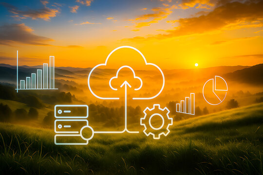 Business wooden cubes illustrating digital business infrastructure with cloud data analytics system integration and technology management concept.