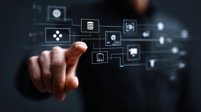 Innovative professional interacting with futuristic digital interface, exploring data flow and system connections on a dark background