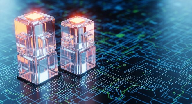 Futuristic digital data blocks glowing with energy on a circuit board background