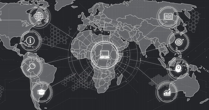 Global data processing with digital world map and connections