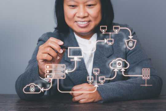 Business woman design drawing cloud technology concept network conncecting. Social network , Internet computer networking connection system structure conceptual, social media  development design.