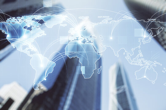 Double exposure of abstract digital world map hologram with connections on blurry cityscape background, big data and blockchain concept