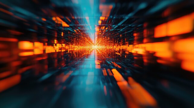 Abstract digital tunnel of glowing orange and blue light particles streaming through a grid, visualizing high speed data transfer, network connectivity and futuristic cyberspace energy