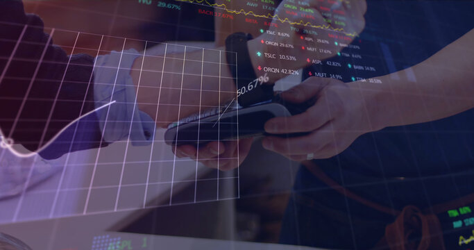 Image of data processing with graph over diverse people paying with smartwatch