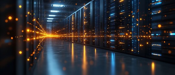 Modern data center server room with glowing lights and advanced technology infrastructure