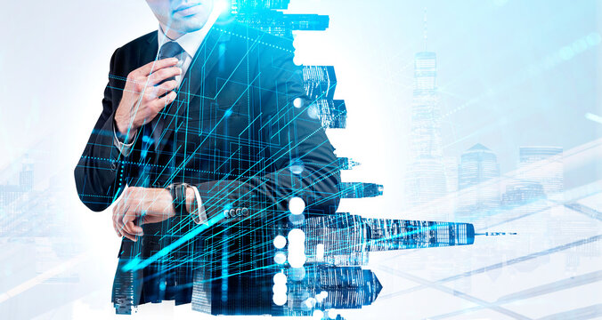 Singapore city skyscraper downtown panoramic view. Businessman wearing formal suit