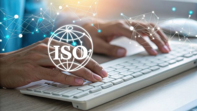Person using tablet and laptop with ISO quality management digital overlay standard certification