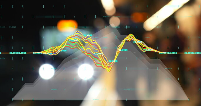 Image of scopes scanning and data processing on screens over traffic lights and cityscape