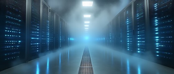 Misty server room with rows of lit racks.