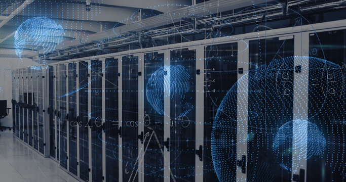 Image of data processing and globe over server room
