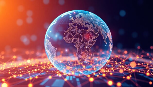 Digital display of a world map in a futuristic interface, illuminated with data streams and glowing indicators