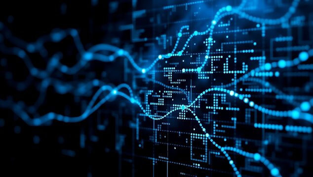 Digital world map with interconnected glowing blue nodes and lines representing global data networks and connectivity.