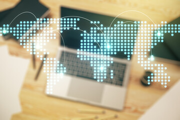 Abstract creative world map on modern laptop background, international trading concept. Multiexposure