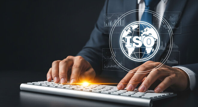 A person typing on a keyboard with an iso graphic overlay and a dark background in a studio shot