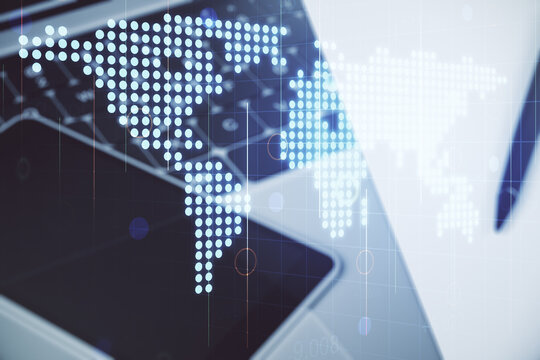 Financial data processing over digital world map background