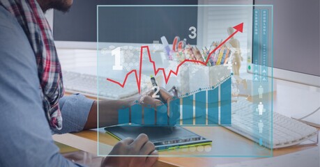 Digital interface with statistical data processing against mid section of man using graphic tablet