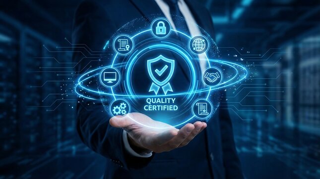 Businessman displaying a holographic 'Quality Certified' icon, symbolizing digital assurance, robust industry standards, and secure compliance in a modern tech environment.