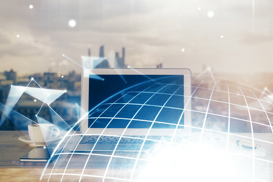 Abstract creative world map with connections on modern laptop background, international trading concept. Multiexposure
