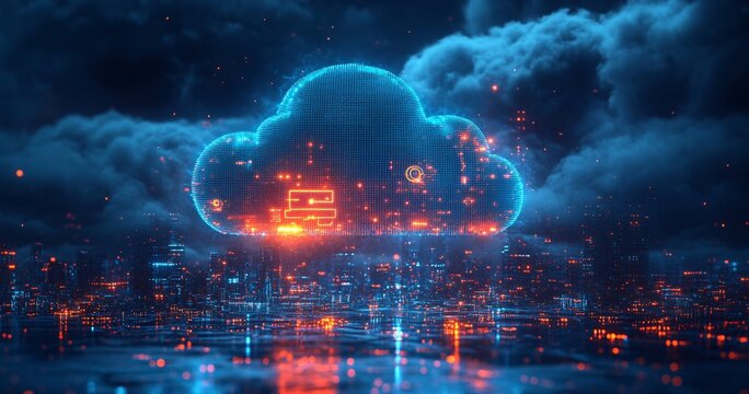 Hand interacting with holographic cloud computing interface on digital background showing cybersecurity and data synchronization concept. Digital Technology & Cybersecurity