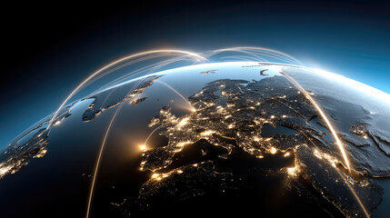 Global network connection concept with illuminated Europe at night, digital data transfer, technology, communication, and worldwide connectivity