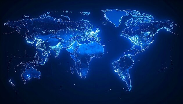 A glowing, stylized world map at night, showcasing global urban areas with bright lights against a dark blue backdrop