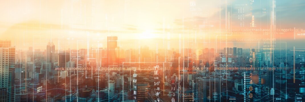 Global financial trends overlaid on a cityscape at sunset, representing data-driven investment and economic forecasts.