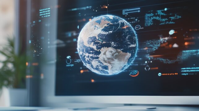 Futuristic user interface displaying planet earth rotating on a computer screen, visualizing data analysis and global connectivity in a technological environment