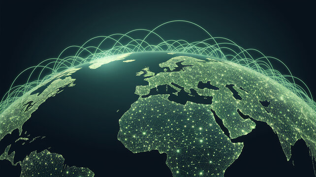 Green glowing network connecting continents on a dark earth globe, representing global communication, network, connection, and technology