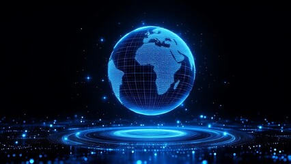Futuristic glowing earth globe made of blue dots over particle field in dark background, symbolizing technology, data, and global connection