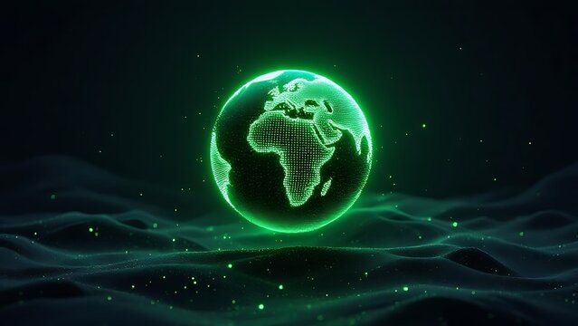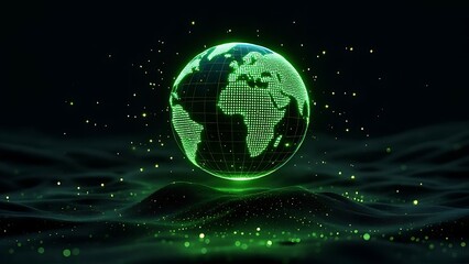 Futuristic glowing earth globe made of green dots over particle field in dark background, symbolizing technology, data, and global connection