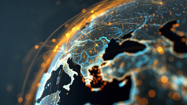 Futuristic Global Network with Glowing Connections Over Dark Background in 3D Earth Representation