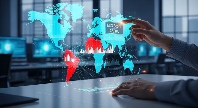 Analyst interacts with a holographic global economic map, highlighting market fluctuations and regional trends.
