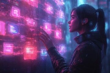 Futuristic hand interacting with floating digital speech bubbles in neon cyberspace, representing technology and communication network