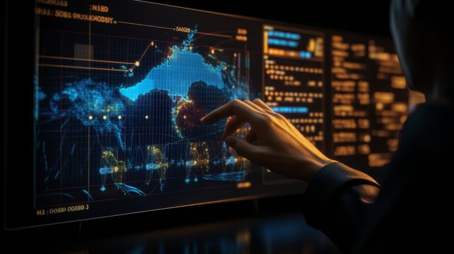 Smart business planning for global trade  a hand pointing at a digital map and financial graphs