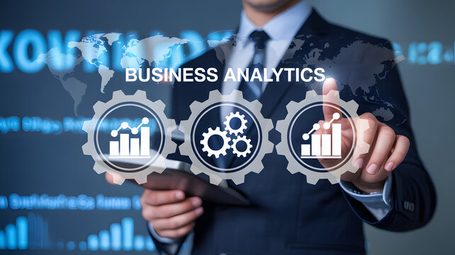 Business analytics and data visualization concept with businessman pointing