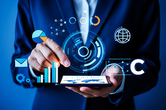 Futuristic digital interface with glowing screens displaying data, graphs, and icons.