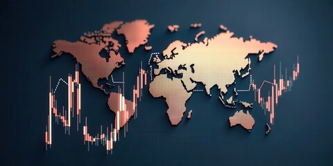 Abstract Financial Data Visualization Featuring a World Map with Candlestick Charts Representing Global Market Trends and Economic Fluctuations