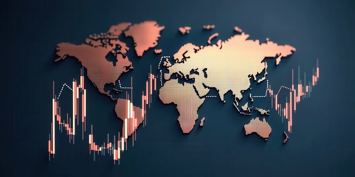 Colorful digital stock market graph displays upward trends overlaid on a world map, representing economic growth and investment opportunities in various regions. Copula
